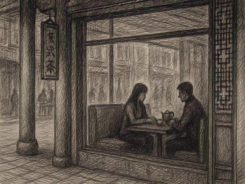 两人对视着,直到服务员走开。女子端起茶碗,抿了一口。